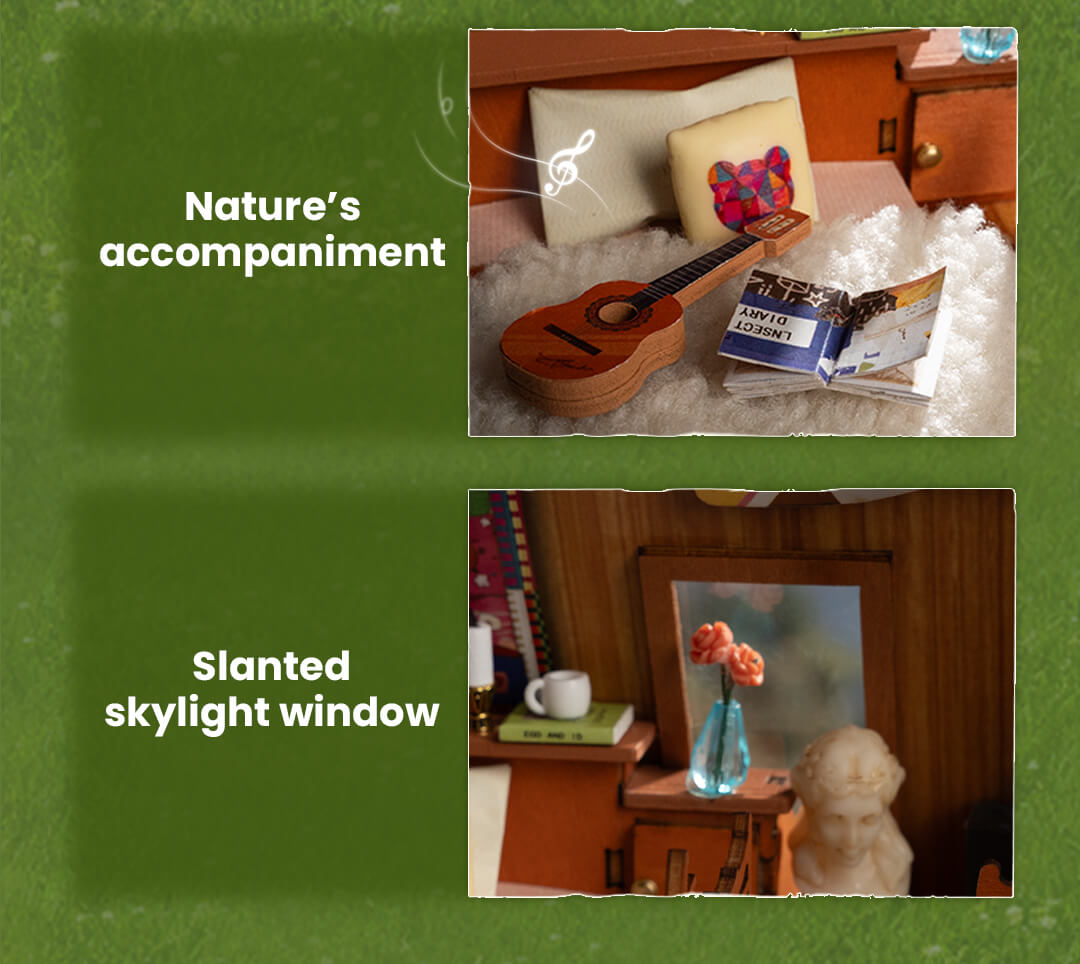 La cabaña tipo A no es solo una muestra de arquitectura elegante e inteligente, sino un refugio de tranquilidad. No hay nada más relajante que disfrutar del aire puro y estar rodeado de naturaleza con las comodidades de la vida moderna. Esto es glamping en su máxima expresión: una escapada de la ciudad con todas las comodidades del hogar. Esto es precisamente lo que Rolife promueve a través de las manualidades. No tienes que abandonar tu ajetreada vida, solo tómate un respiro, elige este relajante proyecto de bricolaje y deja volar tu creatividad. Enseguida te sentirás como si estuvieras haciendo glamping en el bosque, recargando energías en paz.