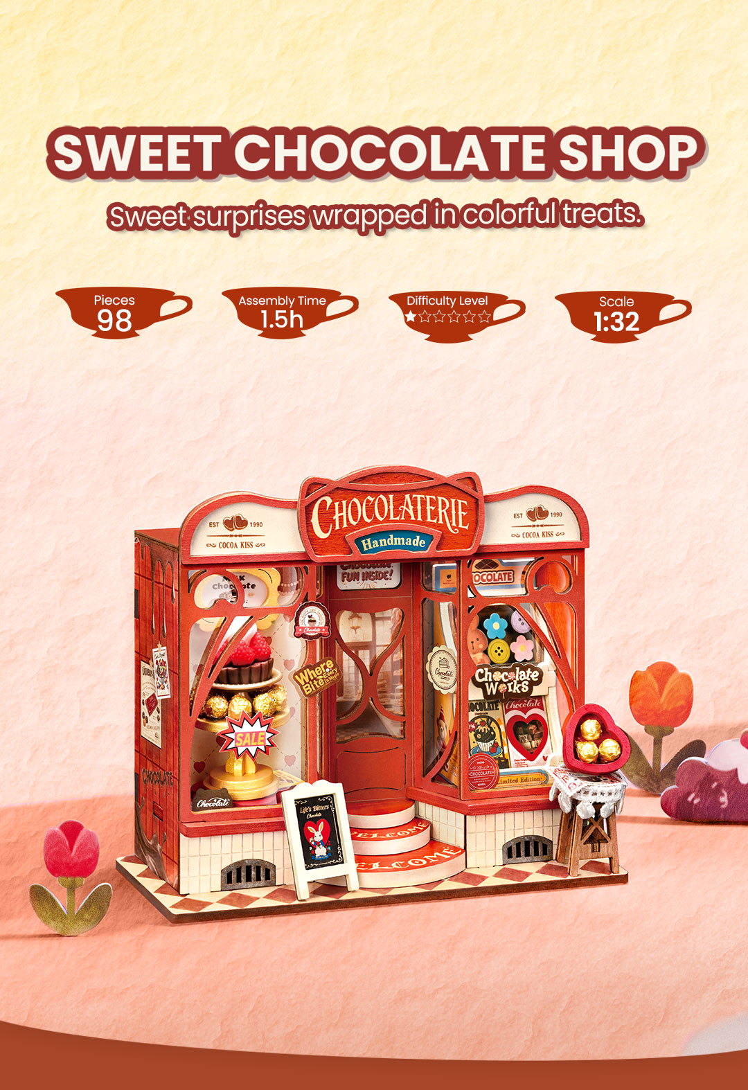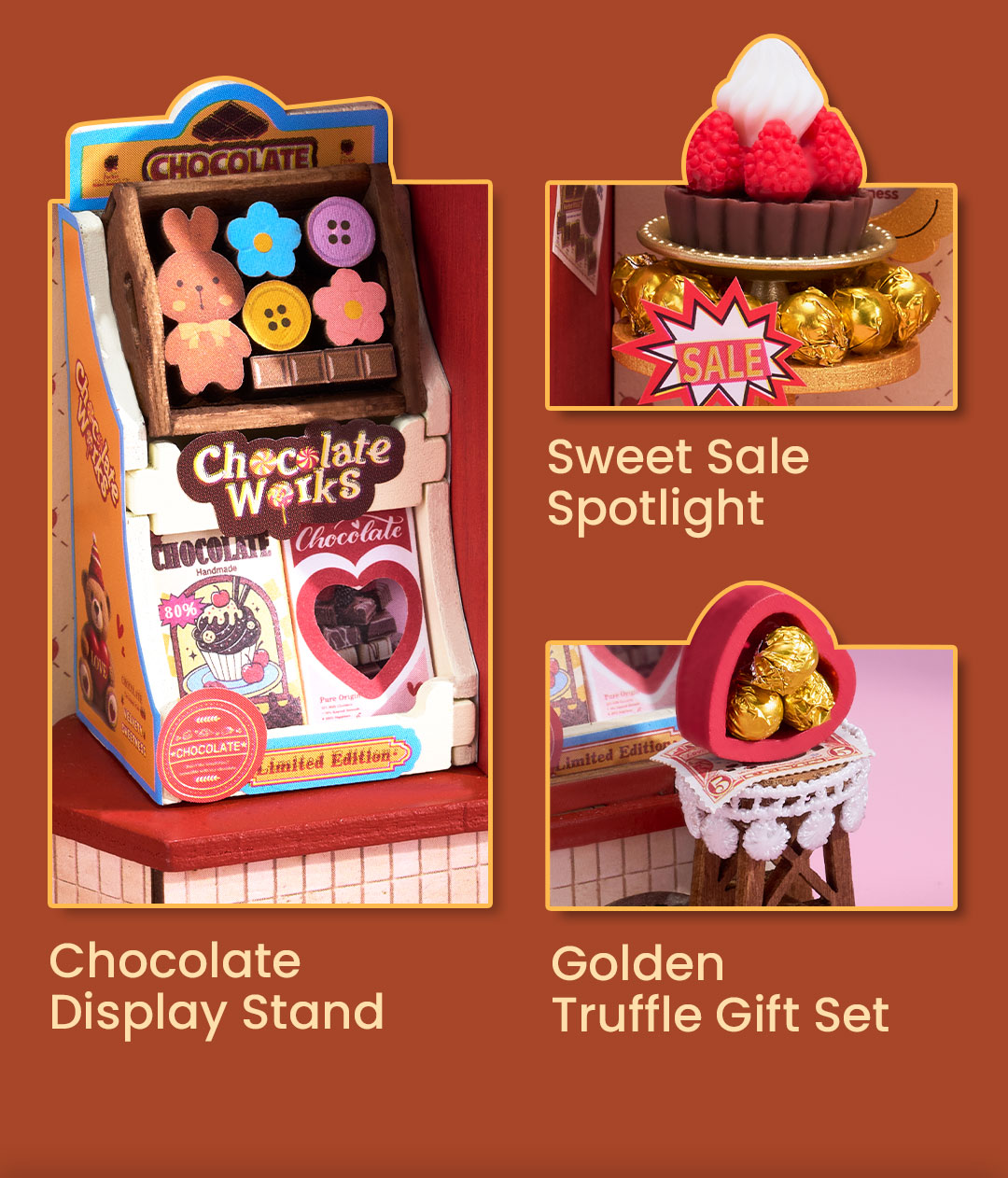 Celebra la artesanía hecha a mano con la Tienda de Chocolate Dulce, un kit de miniatura de bricolaje de una tienda de chocolate artesanal roja. Este modelo apto para principiantes es parte de la colección Rolife Tiny Stores.