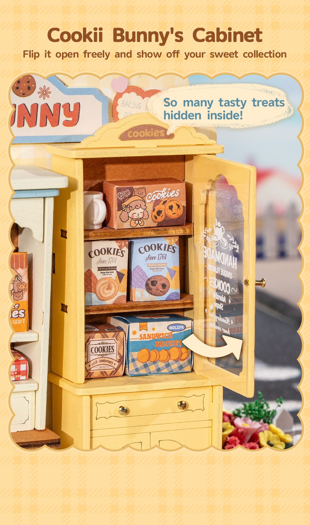 Cookii Bunny presents warm, delectable treats from her fully stocked counters and displays. Build this sweet and lovely DIY miniature bakery and serve creativity.